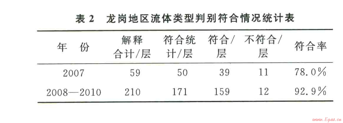 3應(yīng)用效果 將復(fù)雜礁灘氣藏儲層流體識別的上述技術(shù)應(yīng)用于龍崗地區(qū),取得了很好的效果。2008年以前,傳統(tǒng)方法判別符合率僅78%,2008年到2010年通過新方法的應(yīng)用,解釋符合率得到了極大的提高,根據(jù)該氣藏飛仙關(guān)組和長興組已試油證實產(chǎn)流體情況的210層來看,符合統(tǒng)計要求的共l71層,符合l59層,不符合12層,流體類型判別符合率平均達到92.9%(表2)。