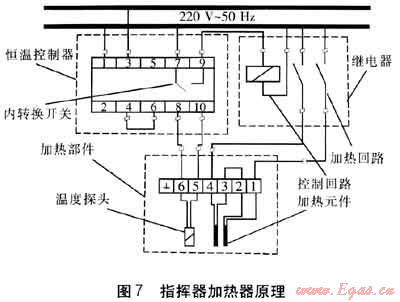 指揮器加熱器結(jié)構(gòu)簡(jiǎn)單,主要由加熱部件(見圖6)、恒溫控制器和繼電器三部分組成,其中恒溫控制器和繼電器只能安裝在非防爆區(qū)域,通過導(dǎo)線對(duì)加熱部件進(jìn)行連接,加熱部件則通過配件安裝在調(diào)壓器指揮器上游信號(hào)管上,通過加熱部件中的加熱元件對(duì)指揮器信號(hào)管內(nèi)的燃?xì)膺M(jìn)行加熱。指揮器加熱器是通過不同的元器件的綜合作用達(dá)到自動(dòng)控制加熱的目的,原理見圖7,圖中的數(shù)字1~10為開關(guān)接線端子編號(hào),接線時(shí)按圖7要求,其中2、5端子為備用。設(shè):