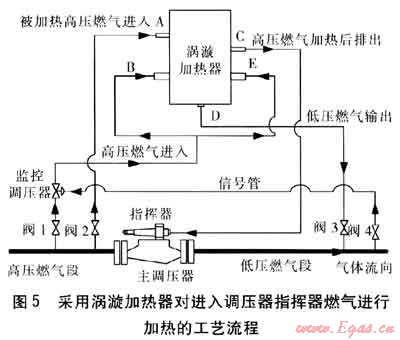 采用渦漩加熱器對(duì)進(jìn)入調(diào)壓器指揮器燃?xì)膺M(jìn)行加熱的工藝流程見圖5。