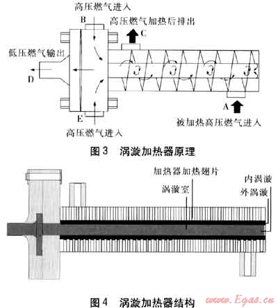 高壓燃?xì)馔ㄟ^渦漩先導(dǎo)燃?xì)饧訜崞?以下簡(jiǎn)稱渦漩加熱器)時(shí),渦漩加熱器將燃?xì)鉁p壓產(chǎn)生的能量轉(zhuǎn)化成高溫?zé)釟饬?,然后利用高溫?zé)釟饬鲗?duì)調(diào)壓器指揮器進(jìn)行加熱。