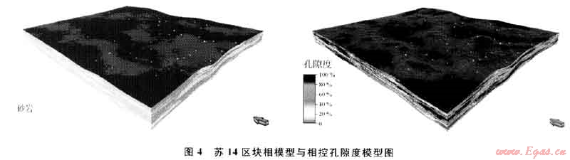 蘇里格氣田為河流相沉積,相控儲(chǔ)層建模很好地解決了該氣田儲(chǔ)層橫向相變快和強(qiáng)非均質(zhì)性的特點(diǎn),在高效開發(fā)過程中,相控儲(chǔ)層建模取得了較好的效果(圖4),為氣田開發(fā)提供了可靠的地質(zhì)模型。