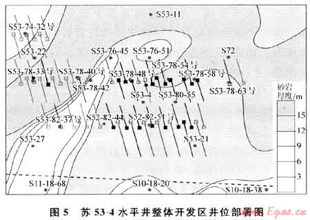 在蘇53-4水平井整體開發(fā)區(qū),取得重要進(jìn)展。2010年確定蘇53-4井區(qū)作為水平井規(guī)模開發(fā)先導(dǎo)試驗(yàn)區(qū)。部署水平井20口(圖5),建成產(chǎn)能4×108m3。開鉆20口,完鉆19口,壓裂投產(chǎn)18口。完鉆水平井19口,平均水平段長867.6m,平均砂巖段長747.1m,砂巖鉆遇率達(dá)86.6%,平均有效儲(chǔ)層長493.9m,有效儲(chǔ)層鉆遇率為57.4%。水平井整體開發(fā)先導(dǎo)試驗(yàn)取得階段性成果。