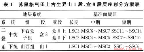 在對(duì)蘇里格地區(qū)地表露頭和鉆井巖心、測(cè)井、地震資料綜合分析的基礎(chǔ)上,利用Cross倡導(dǎo)的高分辨率層序地層學(xué)的理論體系和研究方法,根據(jù)基準(zhǔn)面升降旋回特點(diǎn)及等時(shí)對(duì)比原則、沉積物體積劃分與堆積方式、沉積體系配置以及層序界面特征等因素,將蘇里格氣田上古生界的山1段、盒8段組共劃分為3個(gè)長期旋回、7個(gè)中期旋回和14個(gè)短期旋回(表1),其中的長、中期旋回層序分別與巖石地層劃分方案中的巖性段和亞段單元有很好的對(duì)應(yīng)關(guān)系[1]。