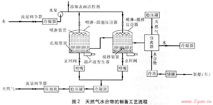 水經(jīng)過流量調(diào)節(jié)器控制流量,經(jīng)冷凝器冷凝,經(jīng)水泵加壓,進入噴淋-鼓泡反應(yīng)器和噴淋-攪拌反應(yīng)器。進入反應(yīng)器之前,向水中添加表面活性劑,以利于水合物的生成。在一級反應(yīng)器(噴淋-鼓泡反應(yīng)器)中,氣體和水一般不能反應(yīng)完全,因此需要設(shè)計二級反應(yīng)器(噴淋-攪拌反應(yīng)器)。在一級反應(yīng)器中,從反應(yīng)器底部進入的天然氣首先經(jīng)過鼓泡裝置與水進行水合反應(yīng),未反應(yīng)的天然氣逸出水面再次和噴淋裝置噴灑的水霧水合,這樣就極大地增加了水合反應(yīng)的接觸面積,加快了水合反應(yīng)。由于在一級反應(yīng)器中已經(jīng)生成了水合物,水合物流入二級反應(yīng)器中時,必然會攜帶大量的水合物晶種,這樣使二級反應(yīng)器更加快速、高效地生成水合物。在二級反應(yīng)器中,天然氣從底部經(jīng)攪拌裝置與水進行水合反應(yīng),未反應(yīng)的天然氣逸出水面和噴淋裝置噴灑的水霧再次水合。在一、二級反應(yīng)器的底部設(shè)置超聲波發(fā)生器,調(diào)節(jié)超聲波的頻率可以增加水合物的儲氣密度,加快水合物的合成。經(jīng)過兩個反應(yīng)器后,水和氣體基本反應(yīng)。