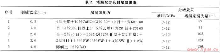 通過材料優(yōu)選確定以GQJ-Ⅱ型、GQJ-Ⅲ型為主要架橋材料,SW-Ⅰ、SW-Ⅱ?yàn)槔w維材料,不同粒徑的CaC03和云母作為片狀填充材料,并配合高失水劑HH-1及無機(jī)鹽Ca0,根據(jù)Howard和Scott的SAN-2工程分布理論[11]確定了各種材料的粒徑級(jí)配,形成抗高溫堵漏配方,并用堵漏儀對(duì)0.5~4mm之間的縫板進(jìn)行承壓堵漏效果評(píng)價(jià)。試驗(yàn)數(shù)據(jù)見表2,通過實(shí)驗(yàn)數(shù)據(jù)可以看出,不同縫寬下承壓能力均高于12MPa。
