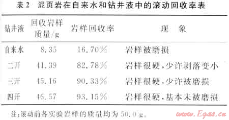 按照石油天然氣行業(yè)標(biāo)準(zhǔn)SY/T 5613—2000《泥頁巖理化性能試驗(yàn)方法》中的標(biāo)準(zhǔn)滾動回收率法評價了群6井失穩(wěn)井段(4400~4500m)的泥頁巖在不同的鉆井液及自來水中的滾動回收率,分析其在不同介質(zhì)中的分散性。實(shí)驗(yàn)結(jié)果如表2所示。