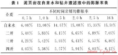將群6井失穩(wěn)井段(4400~4500m)泥頁巖巖屑樣品烘干后粉碎成粉末,用100目分樣篩過篩,收集100目篩下的巖屑粉末。取該粉末10.0g于頁巖膨脹性測定儀的樣品筒中,在4.1MPa壓力下壓5min,然后放入頁巖膨脹性測定儀中,在室溫條件下,測定樣品在自來水和鉆井液濾液中的浸泡不同時間后巖心的總高度及巖心的膨脹率。室內(nèi)模擬配制了第二次開鉆(以下簡稱二開)、第三次開鉆(以下簡稱三開)及第四次開鉆(以下簡稱四開)鉆井液體系,配方采用現(xiàn)場配方。實(shí)驗(yàn)結(jié)果如表1所示。