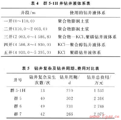 群5-1H井鉆井技術(shù)難度主要表現(xiàn)為:三開后,隨著裸眼段的延長,容易發(fā)生井壁坍塌。同時,由于鉆井液密度的提高,容易引起鉆井液中有害固相增加,造成鉆具遇卡和下套管遇阻。為此,對該井采用了分井段鉆井液技術(shù)設(shè)計(jì)(表4)。