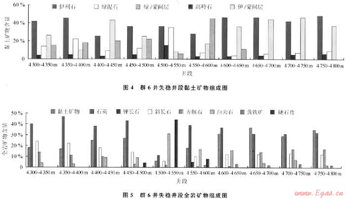 群6井是群庫恰克地區(qū)已完井中發(fā)生鉆井復(fù)雜事件最多的一口井,累計(jì)發(fā)生鉆井復(fù)雜事件49次,具有一定的代表性,研究中選取了群6井的失穩(wěn)井段(4300~4800m)巖屑進(jìn)行礦物組分及其理化性能分析,黏土礦物和全巖礦物分析結(jié)果分別如圖4、5所示。