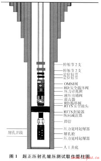 超正壓射孔酸壓測試管柱如圖1所示,主要用于射孔后立即進行改造的儲層,一般是儲層物性較好、通過改造可獲得理想產能的儲層。充分利用超正壓射孔產生的高壓聚能流體對地層形成的微裂縫,降低注酸初始壓力。該三聯(lián)作工藝,不僅能縮短施工周期、成果見效快、有效降低測試成本,而且能減少射孔后壓井液對地層的二次污染。