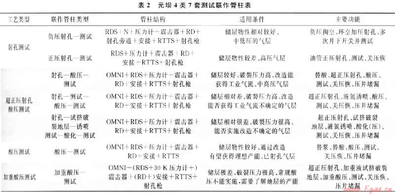 利用地震、鉆井、錄井、測井等資料,在研究區(qū)域構造、砂體展布、地層壓力及溫度、含油氣情況、儲層特征等基礎上,針對不同的測試目的,形成了以“超正壓射孔酸壓測試技術”[4]為核心的4類7套優(yōu)快APR測試技術(表2)。對深度大于6000m的氣井,改造管柱需增加2組伸縮短節(jié)。