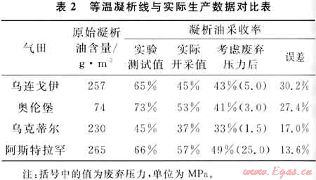 俄羅斯的烏連戈伊、奧倫堡、烏克蒂爾、阿斯特拉罕等凝析氣田比較的結(jié)果值得重視,飽和的油環(huán)凝析氣藏差別很大,不飽和的差別要小些,分析原因有[4]:①測(cè)等溫凝析線時(shí)放棄速度過快會(huì)造成油氣相態(tài)不平衡,從而帶來測(cè)試誤差;②多孔介質(zhì)的存在使采出凝析油量減少;③地層水(含凝析水)對(duì)相態(tài)的影響,一般影響較??;④凝析氣層中剩余原油飽和度的影響,一般影響較大。其對(duì)比結(jié)果見表2。