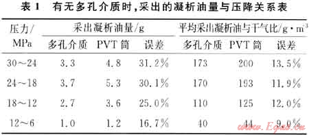 2) 多孔介質(zhì)相態(tài)研究有待繼續(xù)下去,在露點(diǎn)壓力到最大凝析壓力之間,多孔介質(zhì)對(duì)凝析油的采出程度降低可達(dá)31.2%,值得重視。