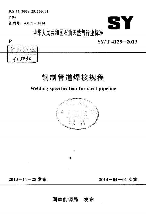鋼制管道焊接規(guī)程 SY/T 4125-2013 :本規(guī)程適用于輸送介質(zhì)為氣體、液體和漿體的長輸管道及油氣田集輸管道的安裝焊接,管道材質(zhì)為碳素鋼、低合金鋼、奧氏體不銹鋼、不銹鋼復(fù)合管.焊接方法為鎢極氬弧焊、焊條電弧焊、熔化極氣體保護(hù)電弧焊(包括自保護(hù)半自動(dòng)焊、氣保護(hù)半自動(dòng)焊、氣保護(hù)自動(dòng)焊)、埋弧焊,以及上述焊接方法相互組合的方法。