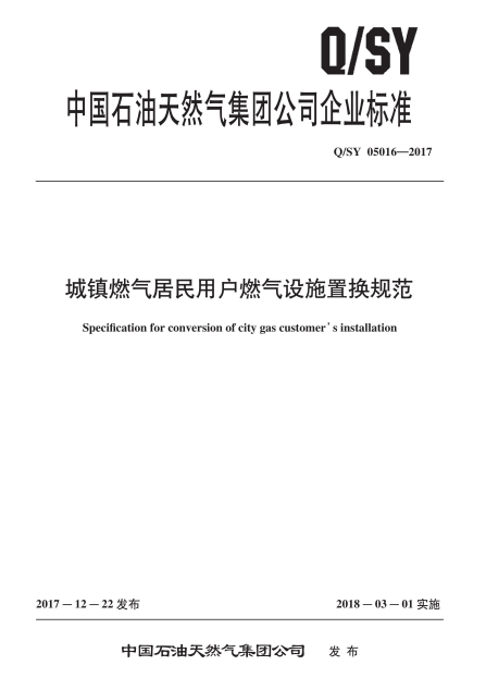 城鎮(zhèn)燃氣居民用戶燃氣設施置換規(guī)范Q/SY 05016-2017