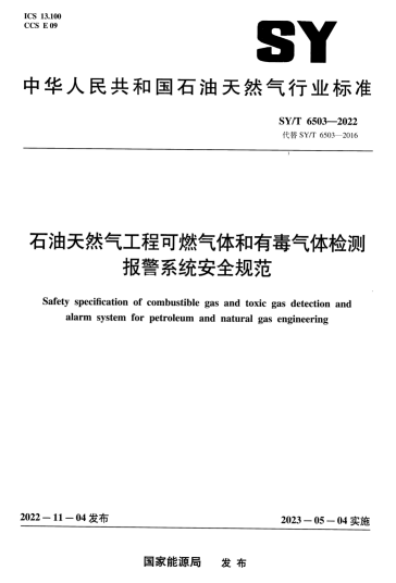 石油天然氣工程可燃?xì)怏w和有毒氣體檢測報警系統(tǒng)安全規(guī)范SY/T 6503-2022:本文件規(guī)定了石油天然氣工程中可燃?xì)怏w和有毒氣體檢測點的確定,探測器、報警控制單元和現(xiàn)場警報器的選用、安裝、檢查、維護(hù)、檢定及報廢等基本要求。